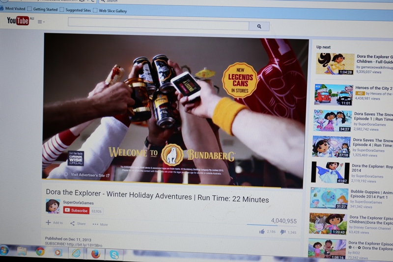 Last night, I sat her down in front of a laptop and let her watch an episode of Dora on YouTube. Right away an ad filled the screen for Bundaberg Rum. Bundaberg Rum is a brand owned by Diageo Australia. All of this happened mid-evening, before 9pm.
