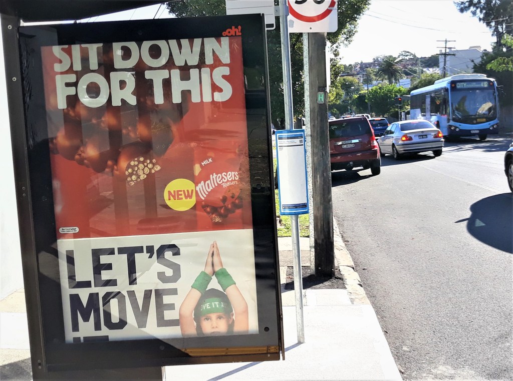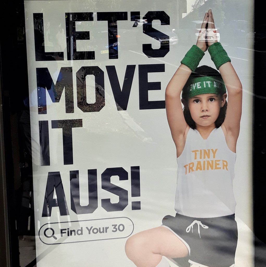 Sharing the billboard with and cleverly undermining a taxpayer-funded marketing campaign from the Australian Sports Commission which encourages Australian children to “find your 30” minutes of physical activity each day.