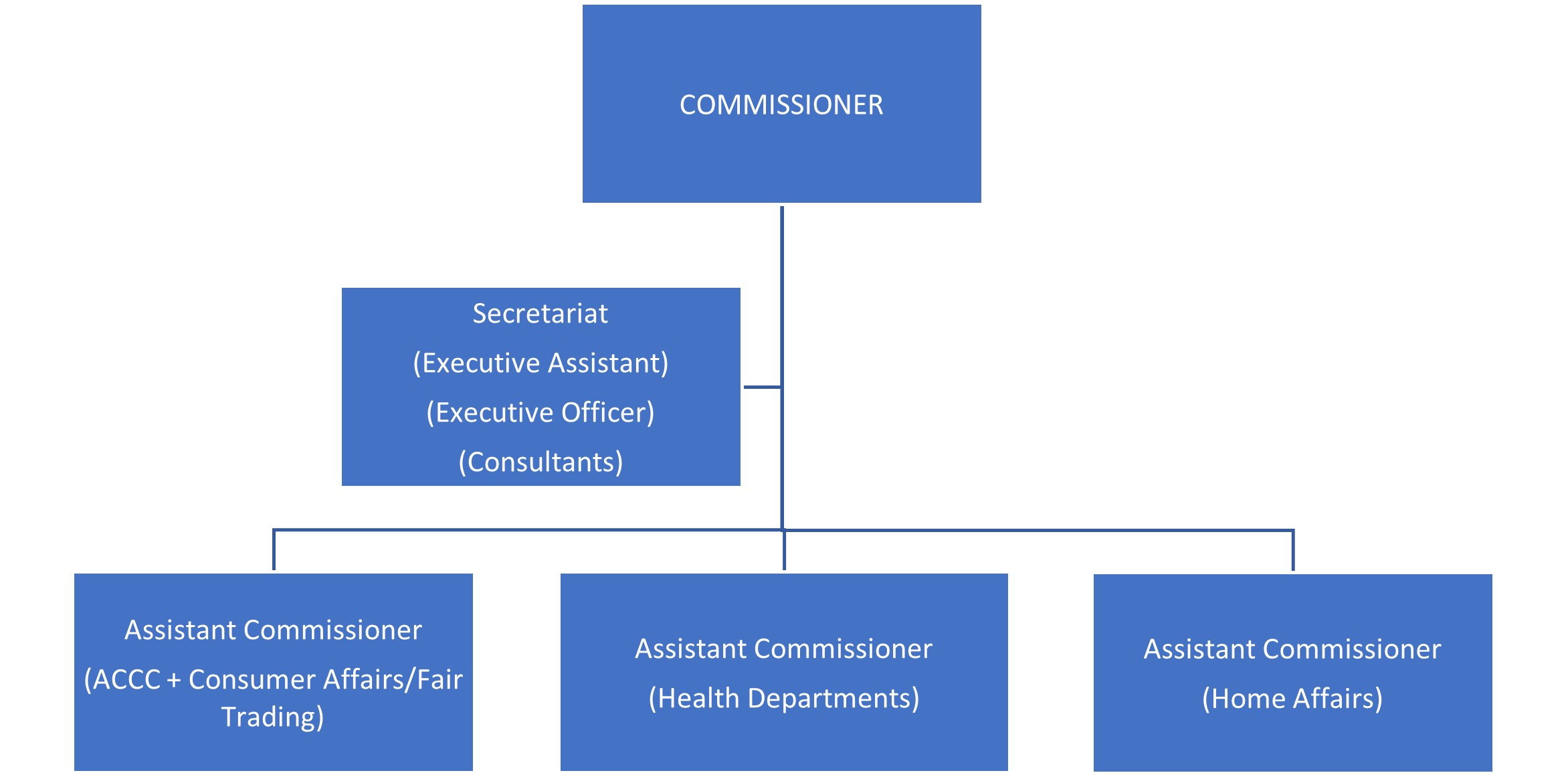 The E-cigarettes Commissioner would meet periodically (say, monthly) with one or more of the Assistant Commissioners to ensure a co-operative enforcement approach is being followed by relevant regulatory bodies and report (say, quarterly) to the Health Ministers’ Meeting, Consumer Affairs Forum, and the relevant Minister for Home Affairs.